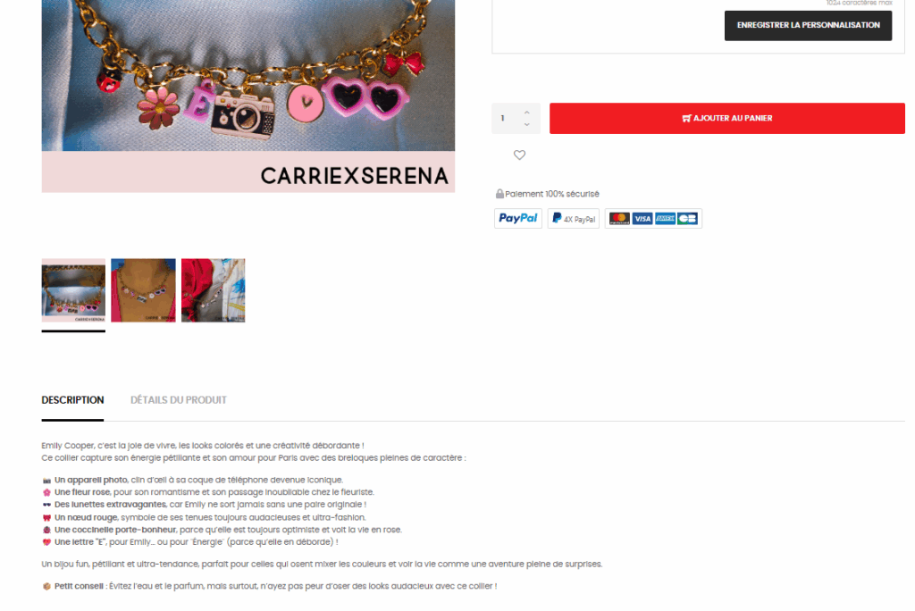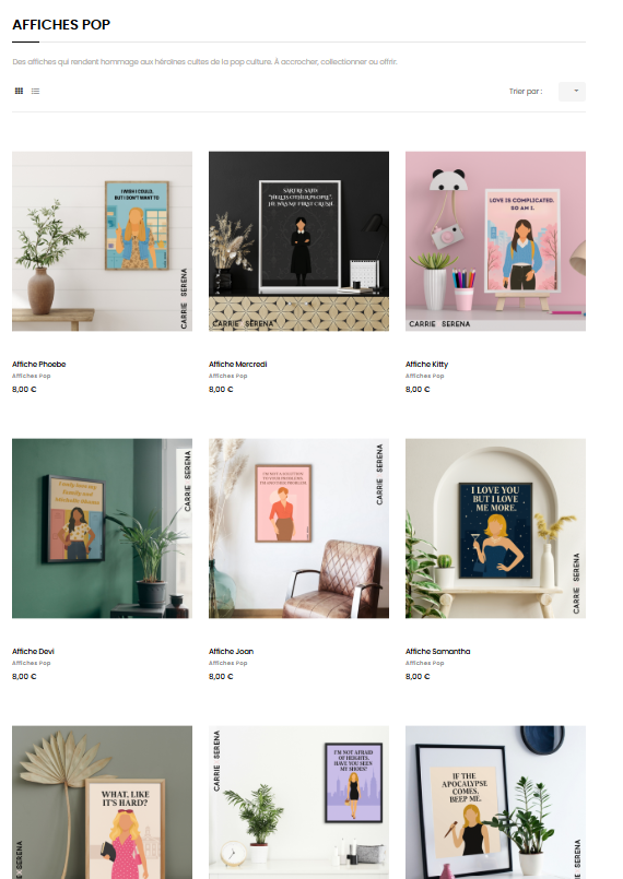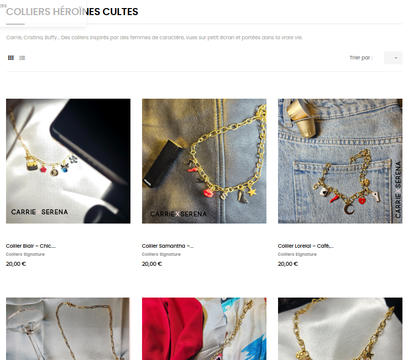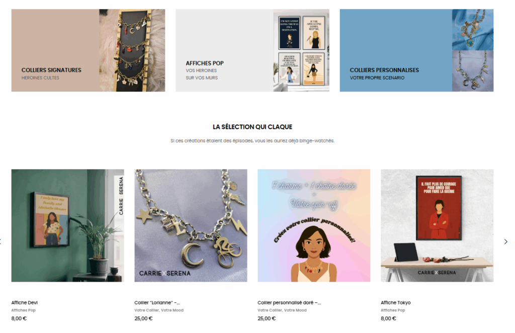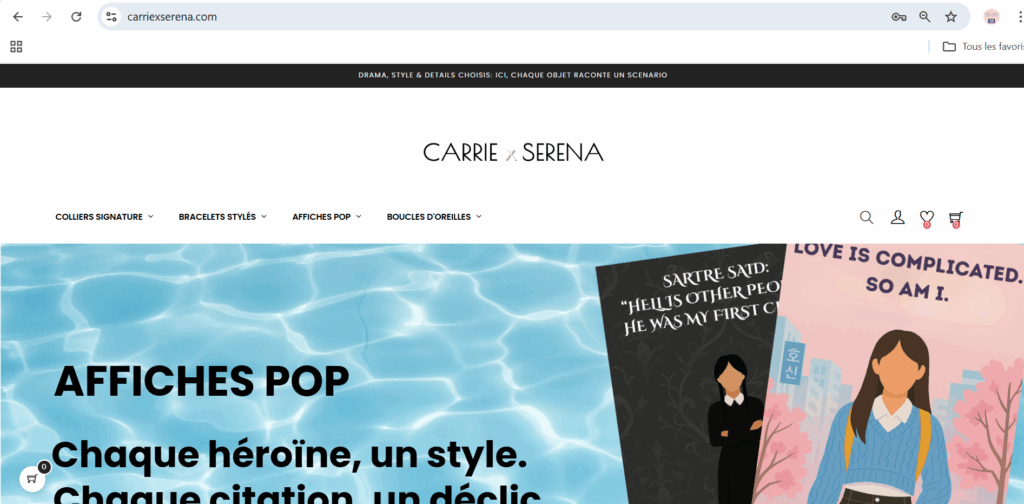 Carrie x Serena est ma première boutique en ligne (personnelle), née de mon envie de lier mes inspirations créatives et mes compétences digitales. J’ai créé une marque de bijoux et d’affiches inspirées des héroïnes de séries TV, avec un univers pop, moderne et complice.